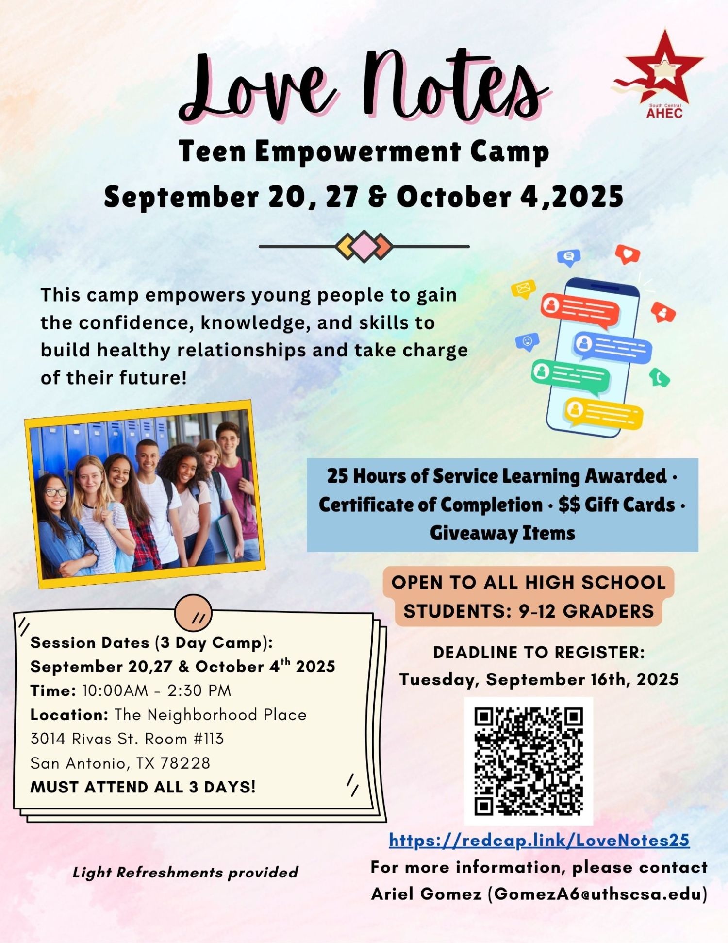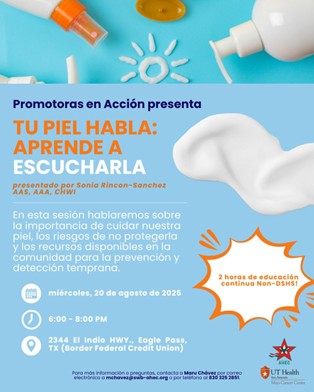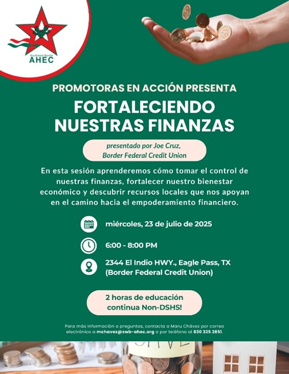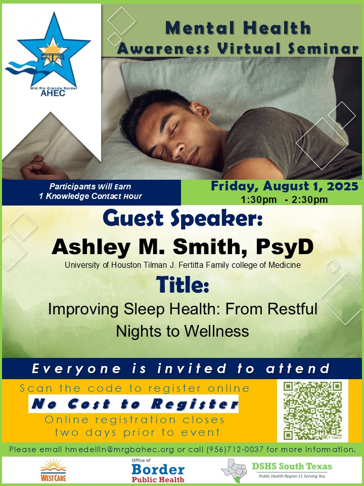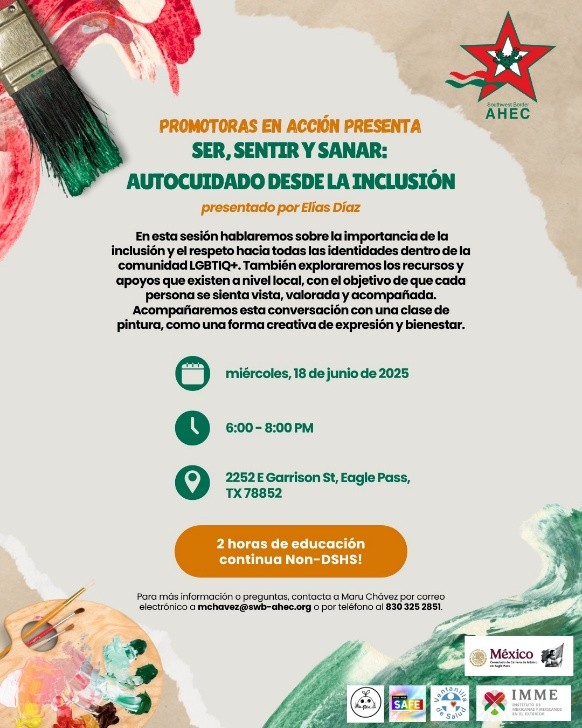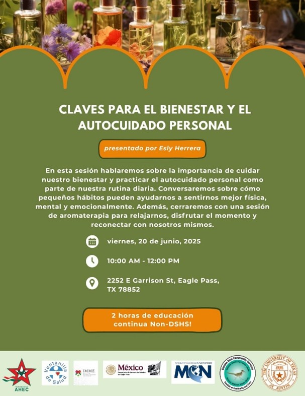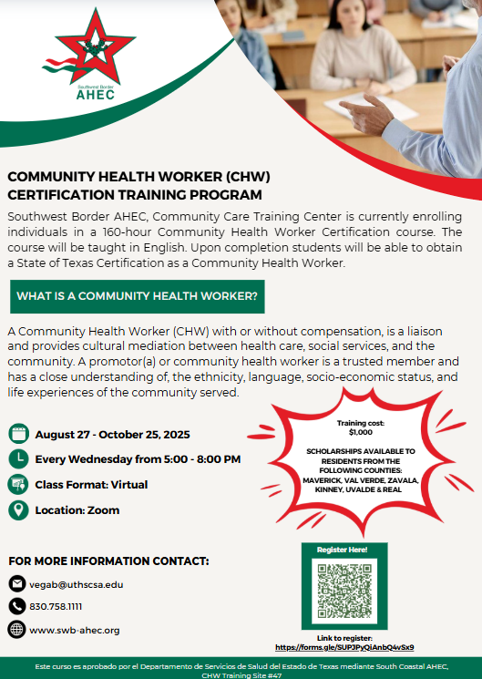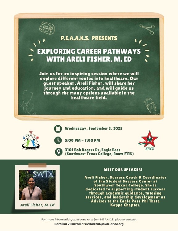 Welcome to the latest AHEC Newsletter with valuable health and education information! | |  | | | | | Welcome to the Fall 2025 South Texas AHEC Newsletter | | | | Recent Successes | Future Events | Learning Opportunities | Health News | | | | Recent Successes Follow South Texas AHEC on Facebook @STAHEC South Texas AHEC - Empowering Health, Uniting Communities  Our South Texas AHEC Family August 28, 2025 The South Texas Area Health Education Center sincerely thanks you once again for your unwavering partnership, collaboration, and support. We are thrilled to share that our program has been funded through August 2027! This continued support is a testament to the collective advocacy and dedication of our partners like you. Your involvement has been instrumental in advancing our mission to improve healthcare access, strengthen the workforce, and promote the well-being of underserved communities across South Texas. We look forward to continuing this important work together and building a healthier future for our region. AHEC Works! With gratitude, South Texas AHEC Team The South Texas AHEC Program, along with members of each center (South Central AHEC, Southwest Border AHEC, South Coastal AHEC, Lower Rio Grande Valley AHEC, and Mid Rio Grande Border AHEC), and the School of Nursing Dean, Dr. Sonya Hardin (seated center) gathered, collaborated and planned for the future in a day long All AHEC meeting. The important work each center is doing was highlighted, along with the strengths we hold and our goals moving forward. | | Follow Southwest Border AHEC on Facebook @SWBAHEC TRIO Career Exploration Presentation On June 6, 2025, Southwest Border AHEC presented a motivational and health career exploration talk to students in the Eagle Pass ISD TRIO program. The session encouraged students to believe in their potential, overcome challenges, and stay committed to their educational goals. In alignment with TRIO's mission to support low-income, first-generation, and students with disabilities in achieving college success, the presentation highlighted the wide range of opportunities in health care careers. Students were introduced to different pathways in the health professions and were reminded that perseverance, dedication, and self-confidence can open doors to a successful future. For more information, contact Bonifacio Vega at (830) 758-1111. MET Youth Build Talk On June 11, 2025, Southwest Border AHEC delivered a motivational talk to MET YouthBuild students who are working toward their high school equivalency credentials. The session emphasized the importance of education as a foundation for personal growth and future opportunities, while also recognizing the students' strengths, resilience, and potential to succeed in both academic and professional pathways. Participants were encouraged to view their efforts as an investment not only in their careers but also in their families and communities. For more information, contact Bonifacio Vega at (830) 758-1111 Jump Into Success Summer Camp On June 16, 2025, Southwest Border AHEC led hands-on health care activities where students attending the Jump Into Success Summer Camp hosted by Southwest Texas College learned about different jobs in the medical field and how health professionals make a difference in their communities. Along with these activities, students enjoyed team games that encouraged teamwork, problem-solving, and making new friends. The camp gave everyone a chance to discover new interests and build confidence for the future. For more information, contact Bonifacio Vega (830) 758-1111 P.E.A.C.H.E.S. - Ser, Sentir y Sanar: Autocuidado desde la Inclusión  On June 18, 2025, Southwest Border AHEC hosted its monthly Promotoras En Accion - Community Health Education Series (P.E.A.C.H.E.S.) in partnership with el Consulado de Mexico Eagle Pass. This session focused on the importance of inclusion and respect for all identities within the LGBTIQ+ community. Participants explored the resources and support available locally. The goal of the session was to ensure that everyone feels seen, valued, and supported. The presentation was accompanied by a painting class, as a creative form of expression and well-being. For more information about this and upcoming sessions, contact Bonifacio Vega at (830) 758-1111 Claves Para El Bienestar y El Autocuidado Personal  On June 27, 2025, Southwest Border hosted a community event focused on the importance of taking care of our well-being and practicing self-care as part of a daily routine. Participants were provided education on how small habits can help increase physical, mental, and emotional health. Participants were also provided an opportunity to experience an aromatherapy session intended to help them relax and enjoy the moment. For more information contact Bonifacio Vega at (830) 758-1111 SWB AHEC - Public Health Fellowship Presentation On June 28, 2025, the Southwest Border AHEC team attended the Public Health Fellowship Conference in Laredo, Texas, where they presented their community project, From Border to Better: Managing Diabetes in Southwest Texas. This gathering brought together the five AHEC centers to showcase their successes in developing public health initiatives designed with and for the communities they serve. The Southwest Border AHEC team highlighted the important role of Community Health Workers in addressing diabetes management and promoting healthier lifestyles along the border region. The event provided a meaningful space for collaboration, learning, and celebrating community-focused efforts. Special thanks to Dr. Bazan and the Mid Rio Grande AHEC team for hosting such an inspiring event. For more information contact Bonifacio Vega, at vegab@uthscsa.edu or by phone at (361) 426-9510 Mental Health First Aid Training and Certification On July 8, 2025, the Southwest Border AHEC team successfully completed Mental Health First Aid training, equipping them with valuable skills to recognize, under
